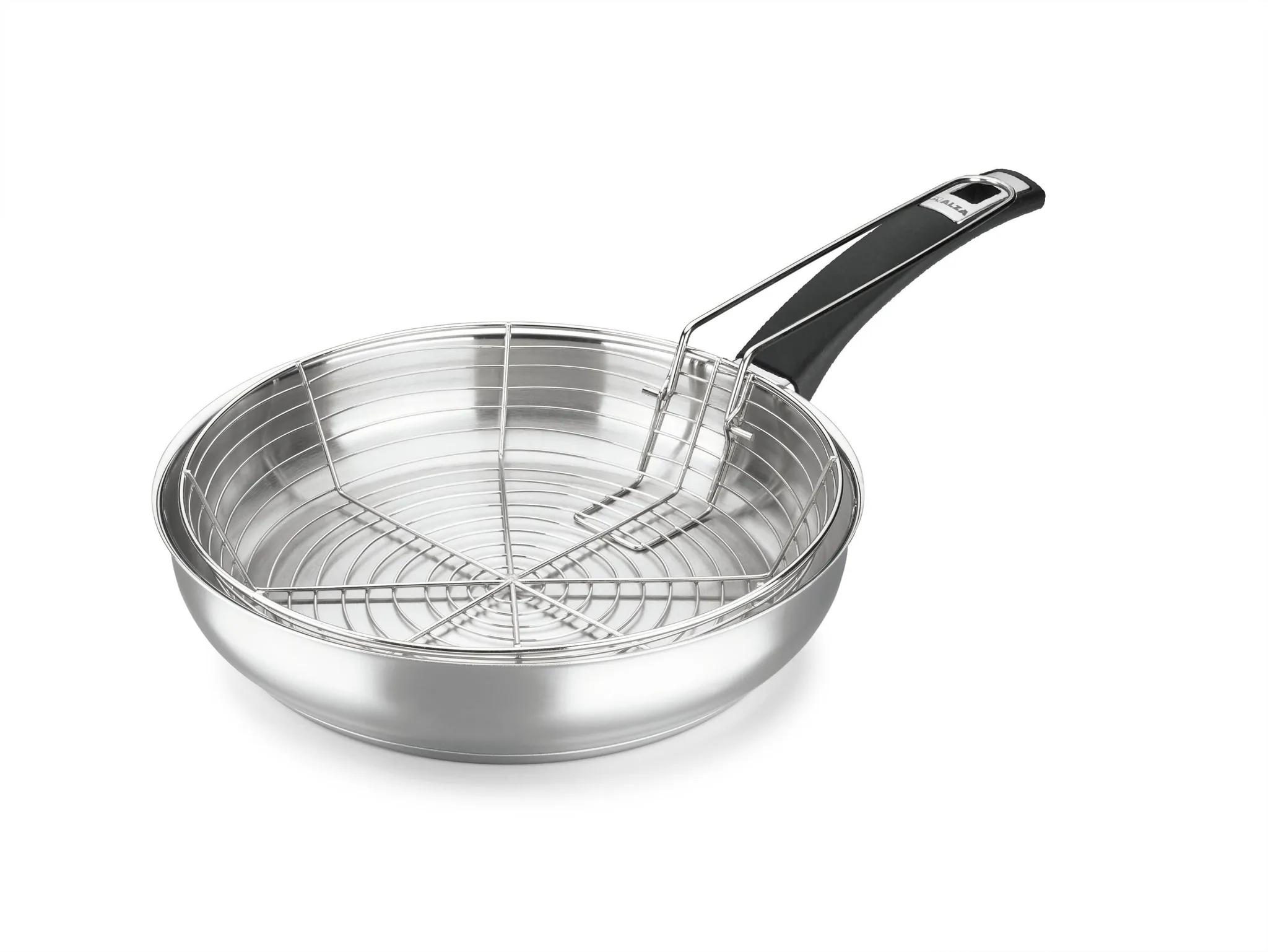 El cestillo para sartén freidora de 28 cm de ALZA es ideal para freír alimentos en mayores cantidades. Fabricado en acero inoxidable 18/10, ofrece resistencia y facilidad de limpieza, siendo apto para lavavajillas. Convierte su sartén en una freidora funcional y eficiente.