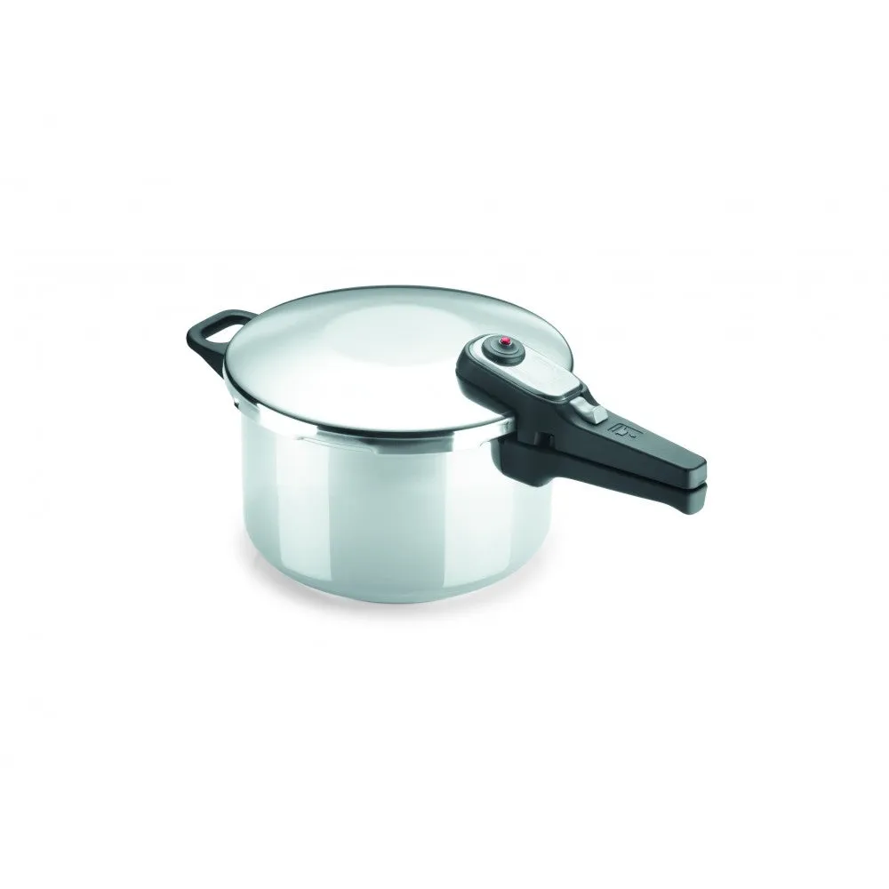 Olla a presión super-rápida TITANPLUS de 4 litros, fabricada en acero inoxidable 18/10 con acabado satinado. Ofrece dos niveles de cocción: rápido (60kPa) y super-rápido (100kPa). Cuenta con triple sistema de seguridad y fondo sandwich termodifusor de alto rendimiento, compatible con todas las cocinas, especialmente inducción.