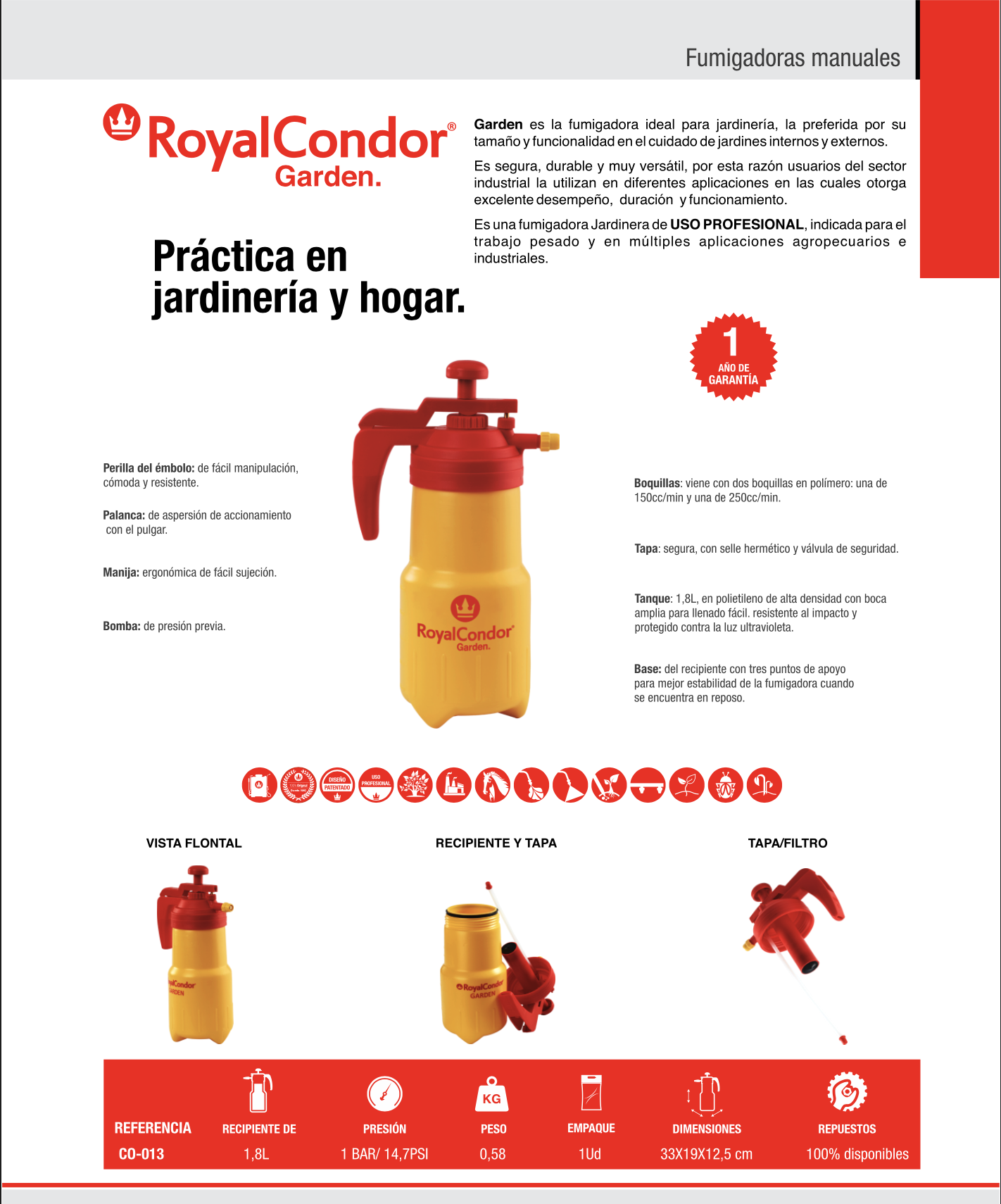 Es la fumigadora ideal para jardinería. la preferida por su tamaño y funcionalidad en el cuidado de jardines internos y externos. Es segura. durable y muy versátil. por esta razón los usuarios la utilizan en diferentes aplicaciones y actividades de desinfección en las cuales otorga excelente desempeño. duración y funcionamiento.