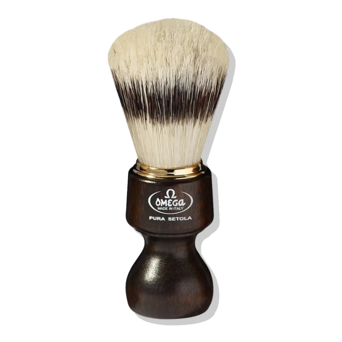 La Brocha de Afeitar Omega está equipada con cerda pura de jabalí de efecto tejón, que proporciona una aplicación uniforme y una espuma densa para un afeitado suave y cómodo.