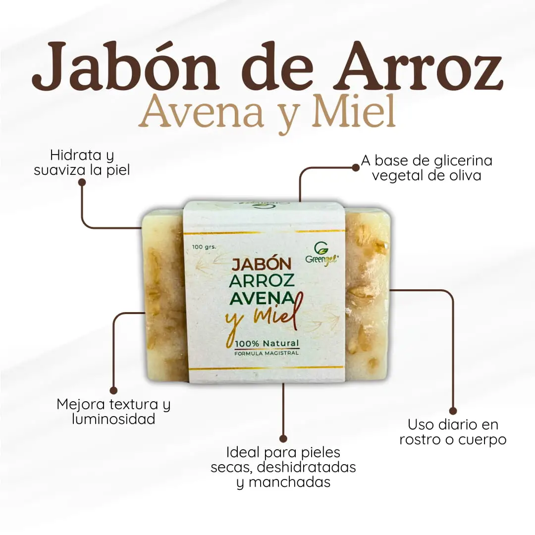 El jabón de avena, arroz y miel está formulado para brindar una limpieza suave, profunda y nutritiva, ideal para pieles sensibles, secas o con afecciones como eczema o psoriasis.