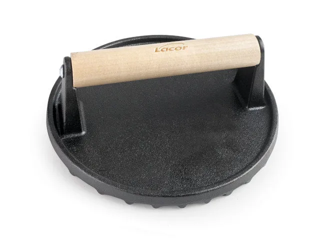Prensador de carne fabricado en hierro fundido de gran calidad y resistente a altas temperaturas.