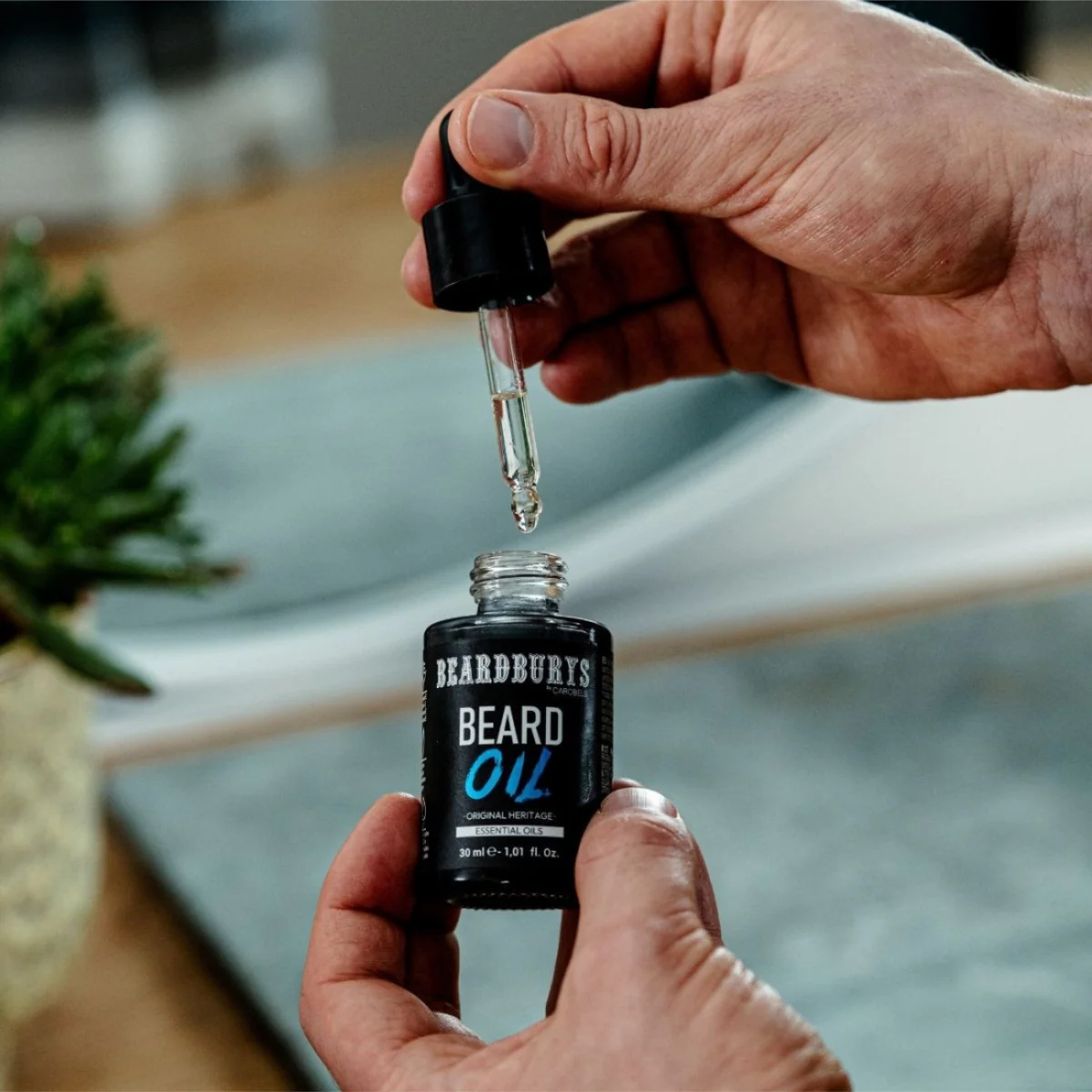 1.Aplicar unas gotas en la palma de la mano, frotar y distribuir de manera uniforme sobre la barba limpia y seca o ligeramente húmeda.