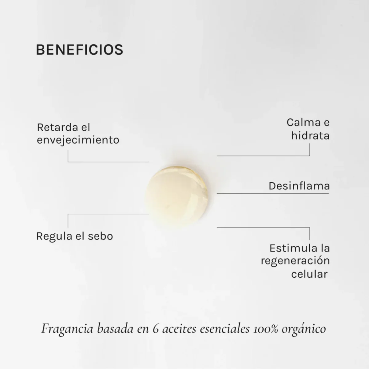 Sus aceites esenciales de Chía, Jojoba, Argán y Oliva retardan el envejecimiento dadas sus propiedades antioxidantes e hidratantes, estimulan la regeneración celular y regulan el sebo, por lo que es ideal para pieles grasas, con rosácea, inflamadas, mixtas y con tendencia al acné.
