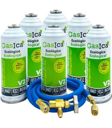 🌡️ Pack 6 Botellas Gas Refrigerante GASICA V2 – R22 R32 R407 R290 R410A + Manguera + Válvula