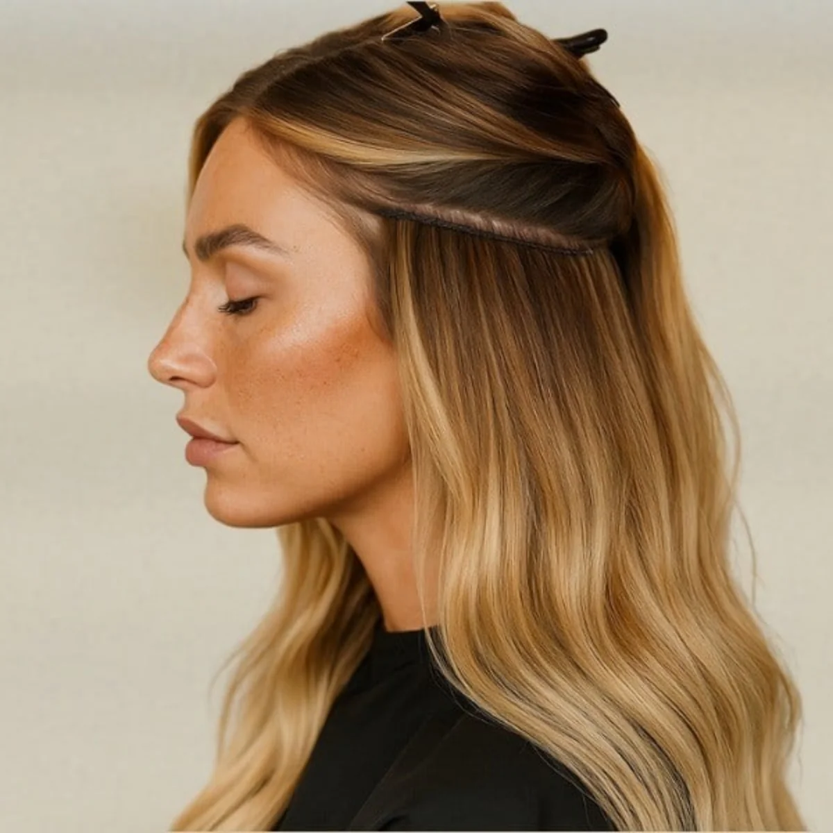 Extensiones profesionales de cabello 100% natural Remy, diseñadas con sistema adhesivo Tape-In para una aplicación rápida, cómoda y segura.
