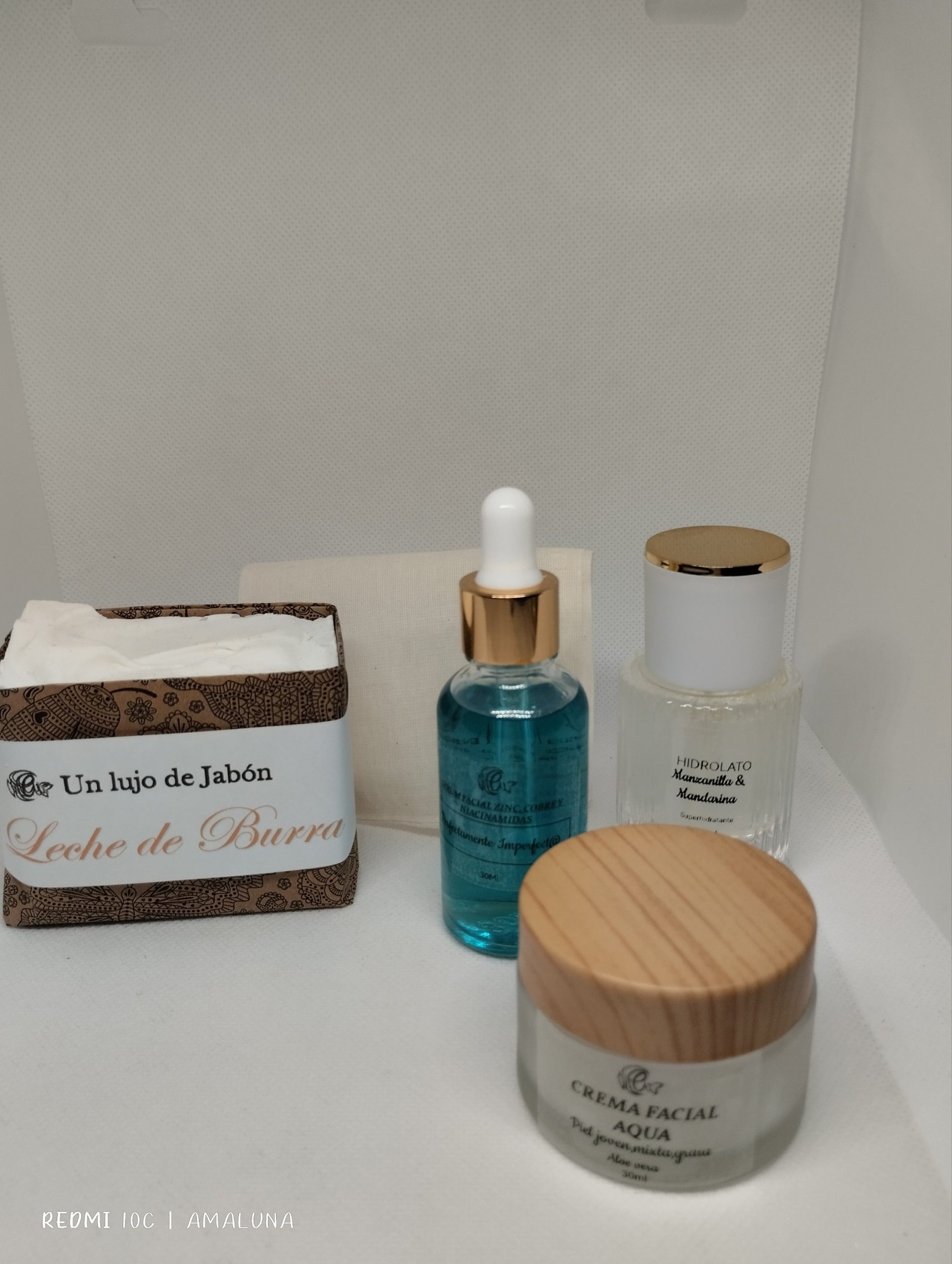 Hidrolato de Manzanilla y cáscara de mandarina.Es un excelente Hidratante y antiinflamatorio ya que la pieles acnéicas alteradas necesitan agua y grasa pero grasas poco pesadas para que me entiendas.como el aceite de jojoba y petita de uva.