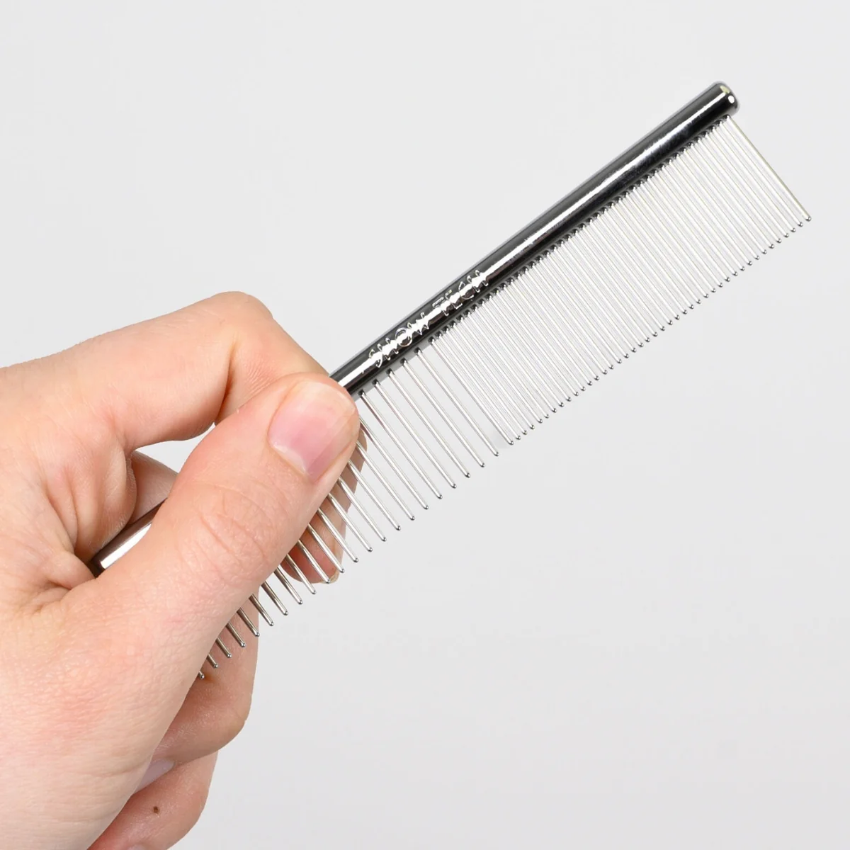 Práctico peine combinado de aluminio con acero inoxidable pulido que es ideal para trabajos finos alrededor de los ojos y las orejas o para el aseo general de razas pequeñas.