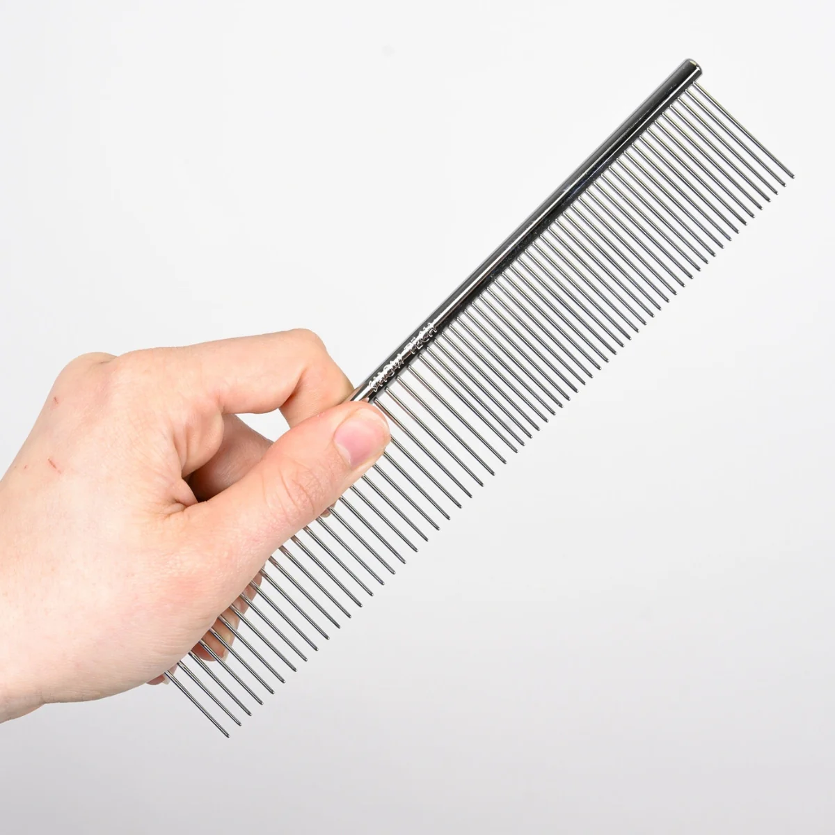 El acabado cromado suave permite que el peine se deslice por el pelaje.
