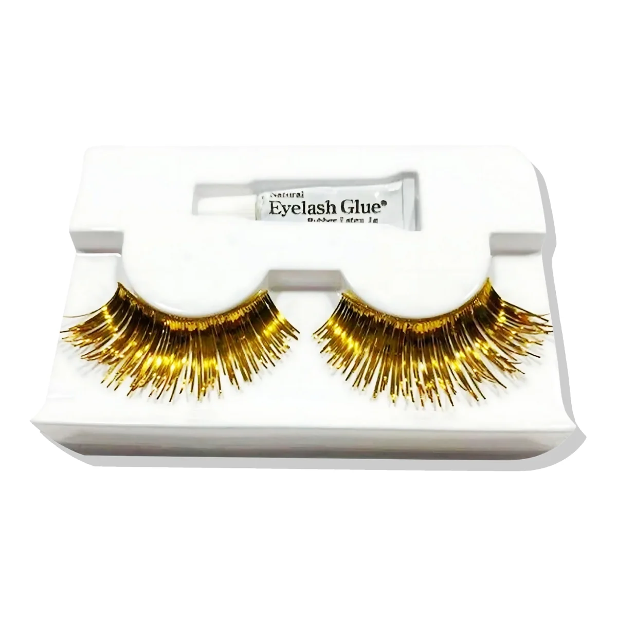 Pestañas postizas doradas para una mirada impactante y deslumbrante, ideales para fiestas o eventos.