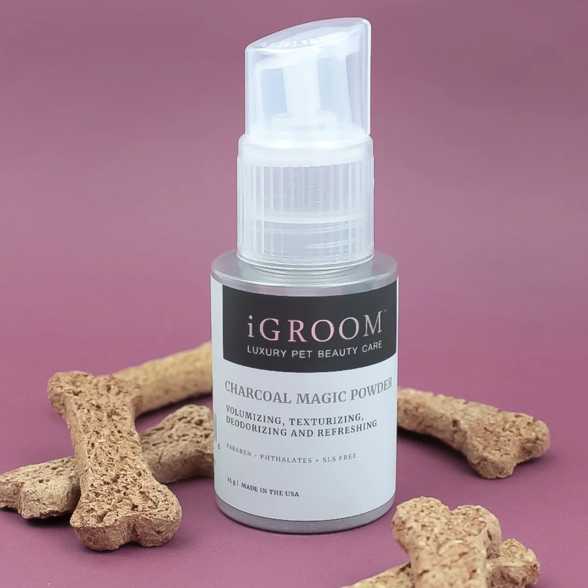 El polvo mágico de carbón de iGroom funciona para todas las razas, recomendado para perros y gatos negros y de colores más oscuros.