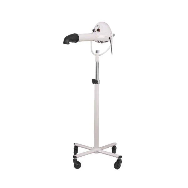Secador de pedestal de alta potencia con un acabado suave que produce una velocidad de viento de 38m/s y un rango de temperatura de 25ºC a 75ºC.