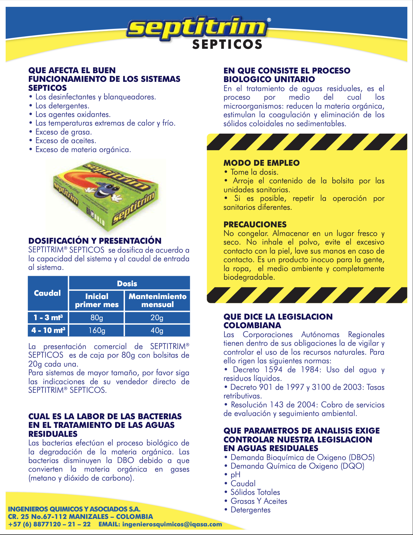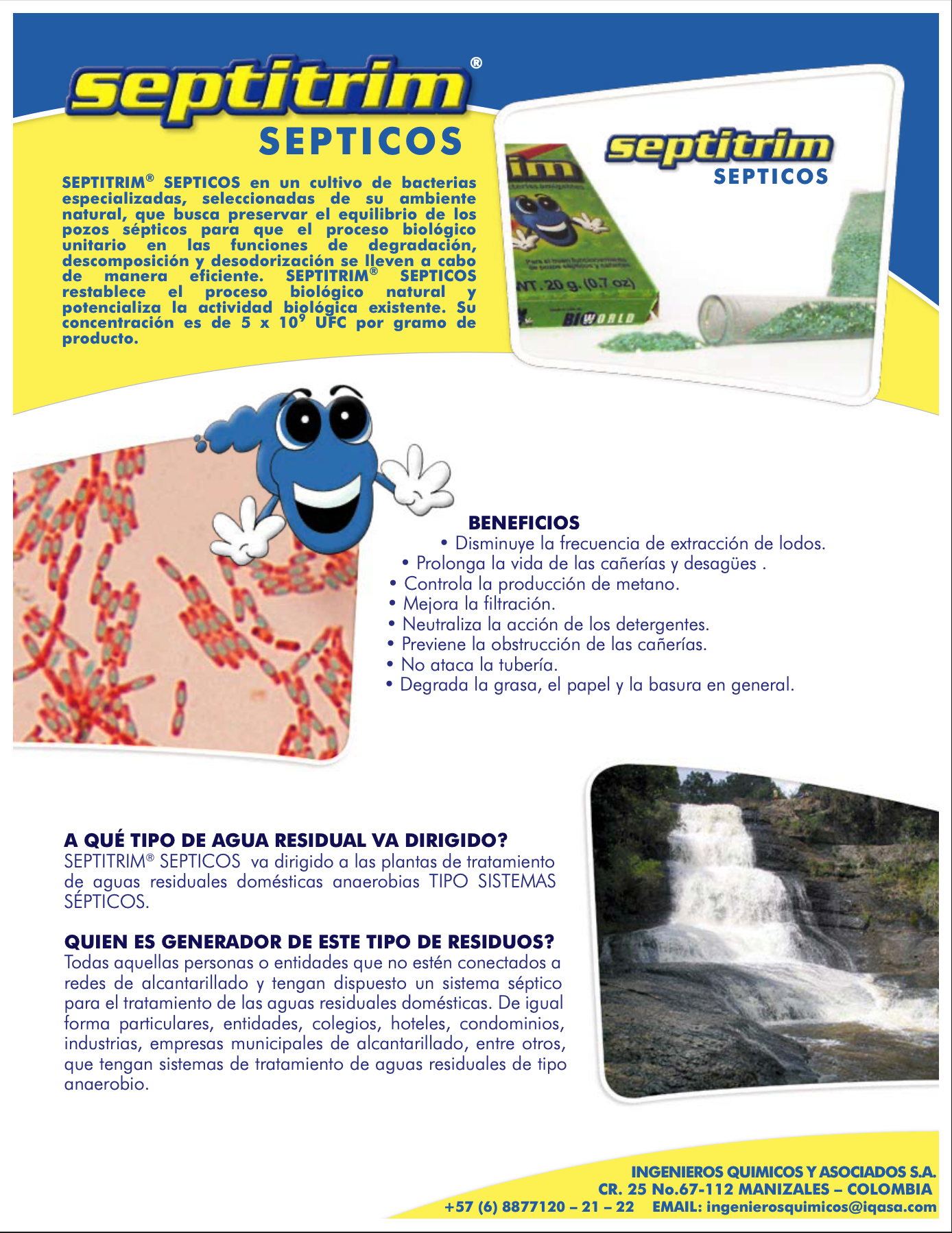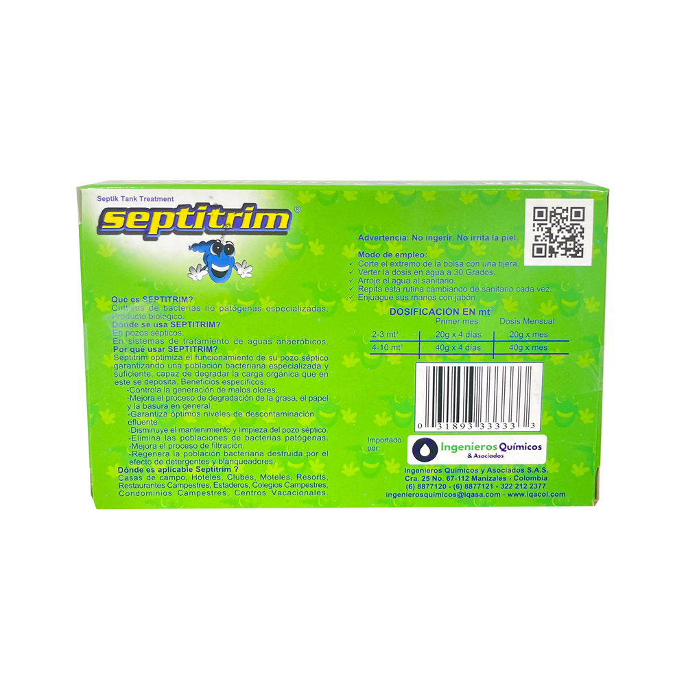 SEPTITRIM® SEPTICOS en un cultivo de bacterias especializadas, seleccionadas de su ambiente natural, que busca preservar el equilibrio de los pozos sépticos para que el proceso biológico unitario en las funciones de degradación, descomposición y desodorización se lleven a cabo de manera eficiente. SEPTITRIM® SEPTICOS restablece el proceso biológico natural y potencializa la actividad biológica existente. Su concentración es de 5 x 109 UFC por gramo de producto.