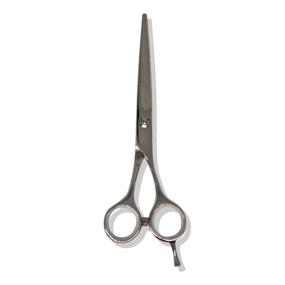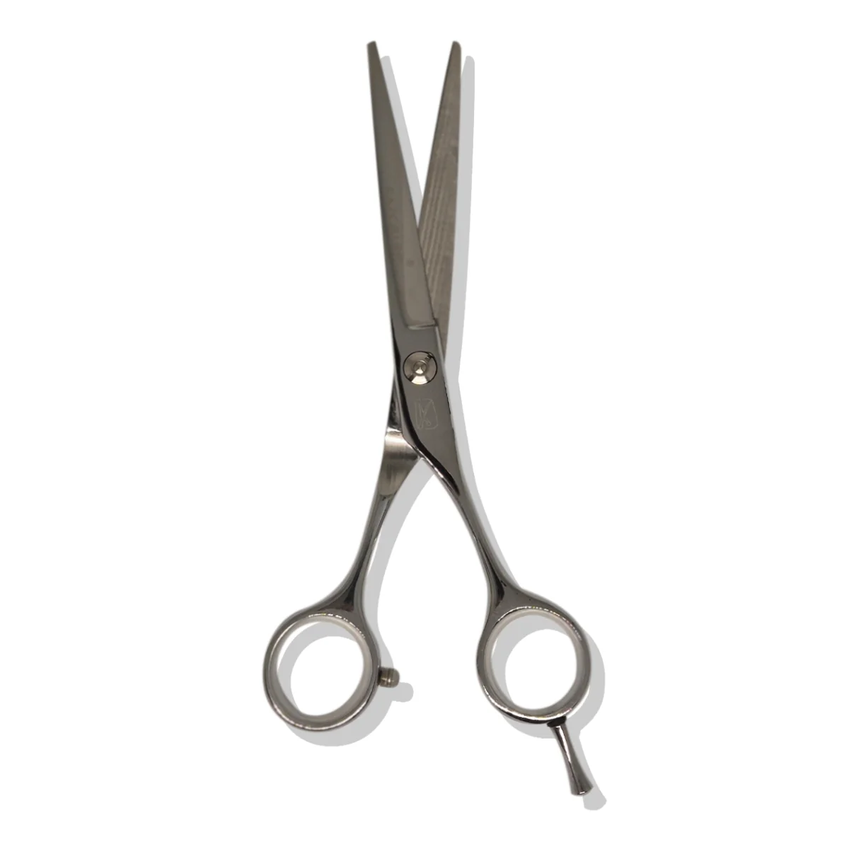 Tijera profesional de corte recto con filo microdentado, diseñada para evitar el deslizamiento del cabello y ofrecer un control estable en técnicas clásicas de peluquería y barbería.